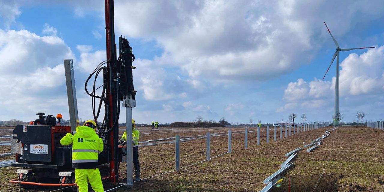 Ab Februar 2025 bearbeiteten schwere Maschinen das über 40 Hektar große Gelände in Zerbst. Nachdem die genaue Positionierung der einzelnen Solarmodule festgelegt wurde, musste die Montage der Unterkonstruktionen vorbereitet werden. Dafür werden an sämtlichen Stellen, an denen später Solarmodule stehen, Pfähle tief in den Boden getrieben. Dies geschieht mit Hilfe einer hydraulischen Pfahlramme. Die Pfähle aus verzinktem Stahl sorgen für die notwendige Stabilität und Verankerung der Solarmodule, damit diese in Zukunft sicher und effizient betrieben werden können.